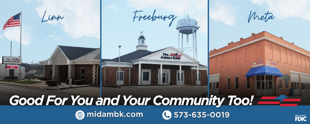With a strong history of exceptional customer service, Mid America Bank has banking roots going back over 100 years. The original bank charter can be traced back to People’s Bank of St. Thomas in 1914. In 1951, the bank moved to Meta, where it became known as Meta State Bank. With the addition of its second location in Linn in 1978, the bank was renamed Mid America Bank to reflect its growing market. Since then, the bank has seen outstanding growth and transformation while still remaining a true locally owned and operated, community bank. Over the years, branches have been added in Wardsville (1993), Holts Summit (2006), Belle (2008) and most recently Jefferson City (2020). In 2021, Mid America Bank acquired the Bank of St. Elizabeth, and in 2022 merged to add four additional branches in Freeburg, Marys Home, Osage Beach and St. Elizabeth. Mid America Bank is proud to serve Osage and the surrounding counties!